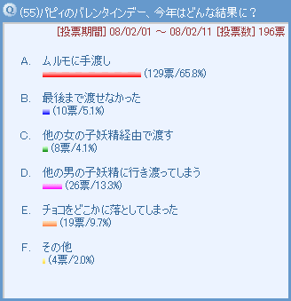 2008年のバレンタインデーはパピィとムルモに注目してみました。チョコがどのように行き渡るか、いろいろ選択肢を用意してみましたが、やはり手渡しがダントツのトップでしたね。正面から渡して、ついでに告白…というパピィにとっては夢のような光景がまたみんなの願いでもありました。また2人の関係は一筋縄ではいかないから、2位と3位の展開も十分にあり得そうですね。最終的にはムルモの手元にチョコは行き渡って欲しいですけど。[コメント一覧]